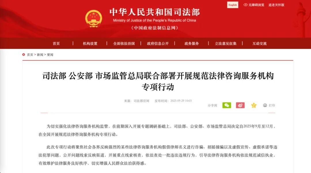 2025929日,司法部、公安部、市场监管总局联合部署开展规范法律咨询服务机构的专项行动,为期3个月。